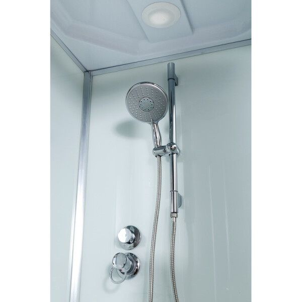 Правосторонняя душевая кабина с крышей с высоким поддоном.