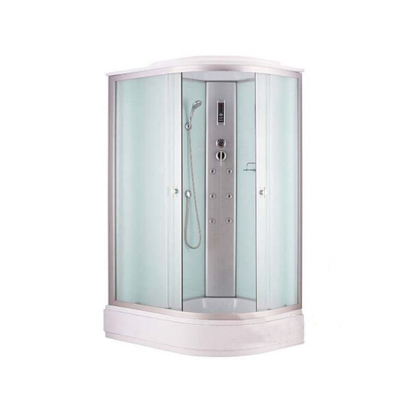 Стенки кабины, профиль и панель выполнены в матовом варианте. Внутри душевого бокса расположена пластиковая панель, на которой установлен смеситель и переключатель на дополнительную лейку.