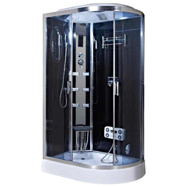 Niagara NG-903-01 – это закрытая душевая кабина ассиметричной формы, левосторонняя, в комплекте с низким поддоном, на металлическом каркасе с регулируемыми по высоте ножками. Передние стекла - тонированные, задние стенки - черное стекло. Профиль полированный.