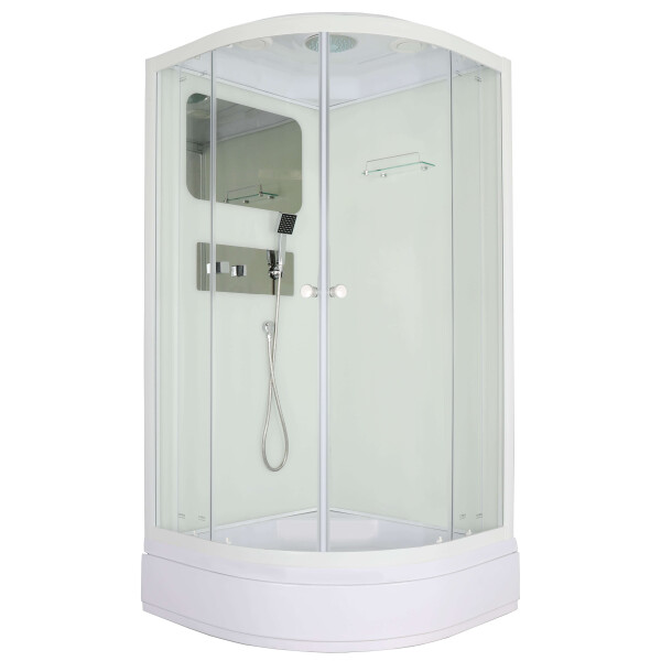 Душевая кабина, средний поддон 26см, полочка, тропический душ, ручная лейка, стекла белые задние и прозрачные передние, большое встроенное зеркало, без центрального столба, без пульта