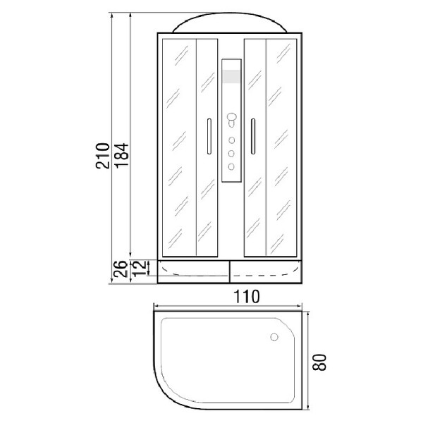 Габариты 110х80х210 см. Преимущества - стильный дизайн, толстые ударопрочные стекла, удобные раздвижные двери, 6 форсунок гидромассажа, надежные двойные металлические ролики. Закрытая душевая кабина полукруглой асимметричной формы, размеры 110х80 см, левосторонняя, оборудованная системой гидромассажа и тропического душа. Стекла закаленные, травмобезопасные, толщиной 4 мм. Поддон средний 26 см, акриловый, в комплекте с сифоном. Задние стенки - белое крашеное стекло. Дверь и боковые стенки - матовое стекло.