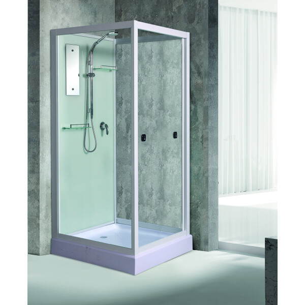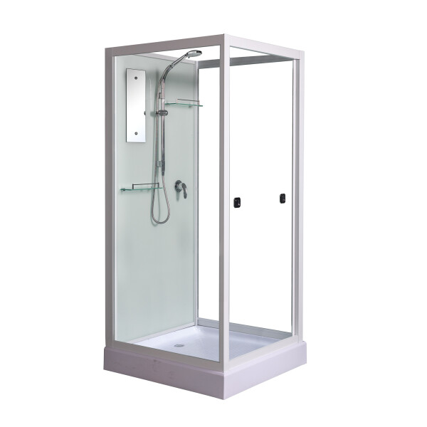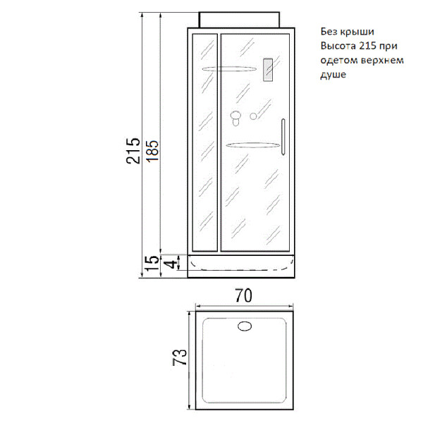 Душевая кабина имеет стильный минималистический дизайн, толстые ударопрочные стекла 6 мм, удобная универсальная раздвижная дверь (открывается внутрь кабины). Сборка - БЕЗ СИЛИКОНА. Открытая душевая кабина прямоугольной формы, размеров 70х73 см, с раздвижной дверью, оборудованная системой ручного и тропического душа. Стекла закаленные, травмобезопасные, толщиной 6 мм. Поддон низкий 15 см, акриловый, в комплекте с сифоном. Задние стенки - непрозрачное крашеное белое стекло. Фронтальные и боковые стекла - прозрачное стекло.