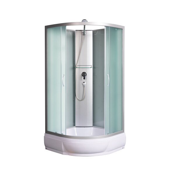 Преимущества – стильный минималистичный дизайн, толстые ударопрочные стекла, удобные раздвижные двери, надежные двойные металлические ролики. Открытая душевая кабина полукруглой формы, увеличенных размеров 100х100 см. Стекла закаленные, травмобезопасные, толщиной 4 мм. Поддон средний 26 см, акриловый, в комплекте с сифоном. Задние стенки - матовое стекло. Дверь и боковые стенки - матовое стекло.