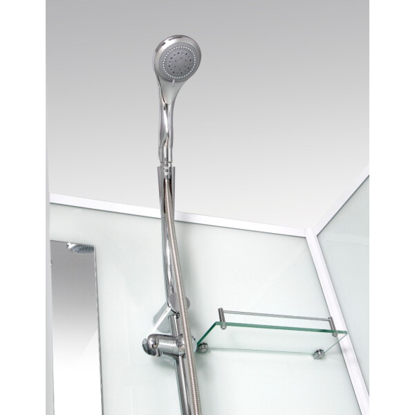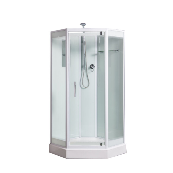 Душевая кабина River Penta Б/К 90 (высота 200 см + 15 см с верхним душем). Преимущества – стильный дизайн, интересная пентагональная форма, вместительный объем. Открытая пятиугольная душевая кабина, с распашной дверью. Стекла закаленные, толщиной 6 мм. Задние стенки - крашеное непрозрачное белое стекло, передние - прозрачные.