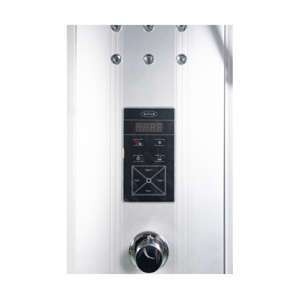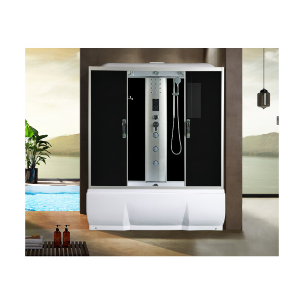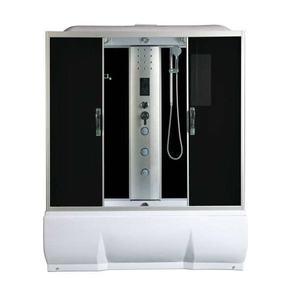 Габариты 150х70х217 см. Преимущества – стильный дизайн, толстые ударопрочные стекла, удобные раздвижные двери, форсунки круглой формы, надежные двойные металлические ролики. Кабина имеет ширину 70 см, что позволяет их поставить в более узкие ванные комнаты. Закрытая душевая кабина прямоугольной формы, оборудованная системой гидромассажа и тропического душа. Стекла закаленные, травмобезопасные, толщиной 4 мм. Поддон глубокий 50 см, акриловый, в комплекте с сифоном. Задние стенки - черное крашеное стекло. Дверь и боковые стенки - тонированное стекло. Профиль - матовый хром.