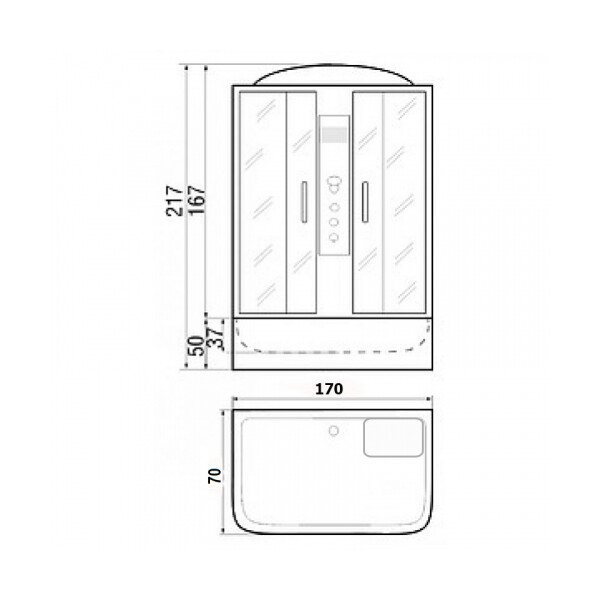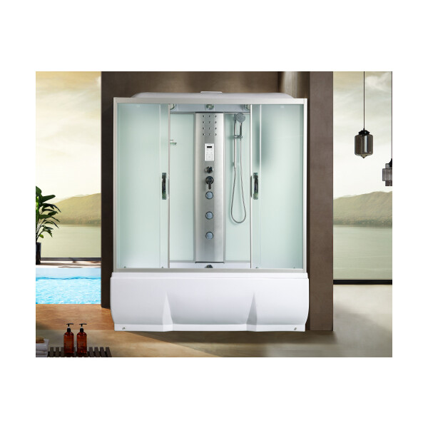 Преимущества – стильный дизайн, толстые ударопрочные стекла, удобные раздвижные двери, форсунки круглой формы, надежные двойные металлические ролики. Кабина имеет ширину 70 см, что позволяет их поставить в более узкие ванные комнаты. Закрытая душевая кабина прямоугольной формы, оборудованная системой гидромассажа и тропического душа. Стекла закаленные, травмобезопасные, толщиной 4 мм. Поддон глубокий 50 см, акриловый, в комплекте с сифоном. Задние стенки - белое крашеное стекло. Дверь и боковые стенки - матовое стекло. Профиль - матовый хром.