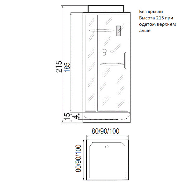 Кабина имеет высоту 200 см, с верхним душем 215 см. Преимущества – стильный минималистский дизайн, толстые ударопрочные стекла 6 мм, удобная универсальная распашная дверь 6 мм. БЕЗСИЛИКОНОВАЯ СБОРКА. Открытая душевая кабина квадратной формы, стандартных размеров 80х80 см, с распашной дверью, оборудованная универсальной штангой для верхнего и ручного душа 2 в 1. Стекла закаленные, травмобезопасные, толщиной 6 мм. Поддон низкий 15 см, акриловый, в комплекте с сифоном. Задние стенки - непрозрачное крашеное белое стекло. Фронтальные и боковые стекла - прозрачное стекло.