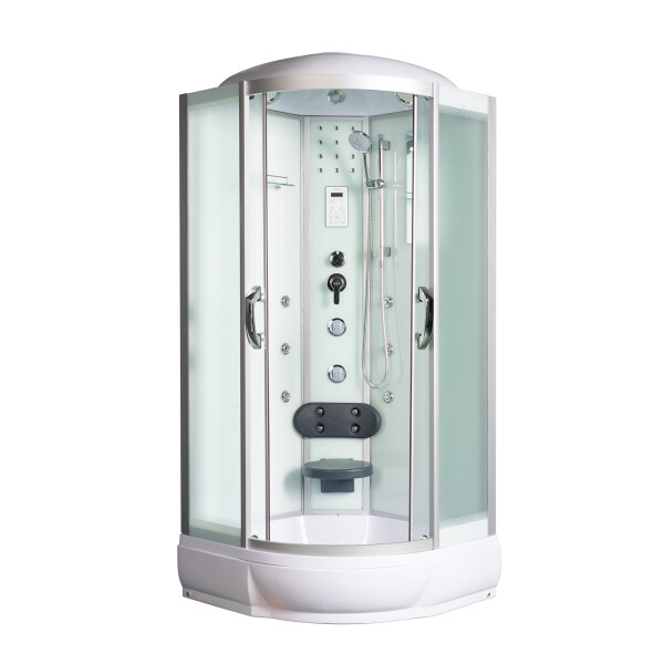 Преимущества – стильный дизайн, толстые ударопрочные стекла, удобные раздвижные двери (дверной проем - 55 см), легкая безсиликоновая сборка, форсунки круглой формы, надежные двойные металлические ролики. Закрытая душевая кабина с раздвижными дверьми, оборудованная системами вертикального гидромассажа и тропического душа. Стекла закаленные, травмобезопасные, матовые, толщиной 4 мм. Профиль матовый хром. Поддон средний 26 см на металлическом каркасе, со съемным экраном и сифоном. Задние стенки БЕЗ рисунка.