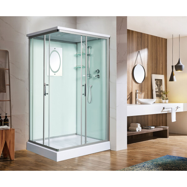 WeltWasser WW500 Laine 1202 - это качественная душевая кабина с богатым функционалом, привлекающая простотой в эксплуатации. Передние и боковые стенки кабины выполнены из надёжного и прочного закаленного стекла толщиной 5 миллиметров. Ему не страшны перепады температур, случайные удары. Задняя стенка изготавливается из идентичного стекла, но окрашивается в белую цветовую гамму. В зависимости от собственных предпочтений, человек может пользоваться ручным душем, выбирая наиболее оптимальное для себя положение, либо верхним. Монтаж кабины осуществляется без силикона. Внутри конструкции свободно помещается высокий человек, ведь её внутренняя высота составляет два метра.