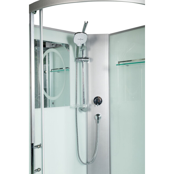 WeltWasser WERRA 801 – качественная душевая кабина с богатым функционалом, привлекающая простотой в эксплуатации. Конструкция оснащена универсальной дверью, которая после установки раздвигается влево и вправо. Передние и боковые стенки кабины выполнены из надёжного и прочного закаленного стекла толщиной 5 миллиметров. Ему не страшны перепады температур, случайные удары. Задняя стенка изготавливается из идентичного стекла и окрашивается в белый цвет. В зависимости от собственных предпочтений, человек может пользоваться ручным душем, выбирая наиболее оптимальное для себя положение, либо верхним. Специальная конструкция штанги позволяет ставить лейку в положение верхнего душа. Монтаж кабины осуществляется без силикона. Внутри конструкции свободно помещается высокий человек, ведь её внутренняя высота составляет два метра.