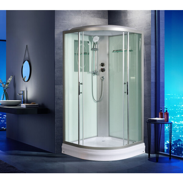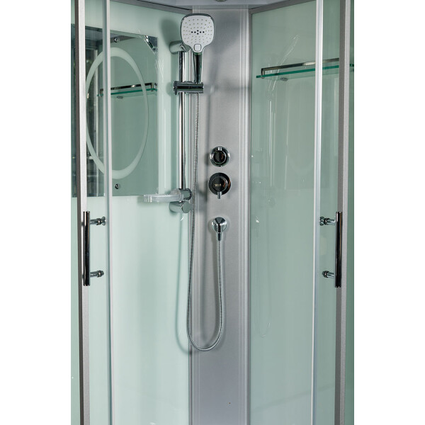 WeltWasser WERRA 802 – качественная душевая кабина с богатым функционалом, привлекающая простотой в эксплуатации. Конструкция оснащена универсальной дверью, которая после установки раздвигается влево и вправо. Передние и боковые стенки кабины выполнены из надёжного и прочного закаленного стекла толщиной 5 миллиметров. Ему не страшны перепады температур, случайные удары. Задняя стенка изготавливается из идентичного стекла и окрашивается в белый цвет. В зависимости от собственных предпочтений, человек может пользоваться ручным душем, выбирая наиболее оптимальное для себя положение, либо верхним. Монтаж кабины осуществляется без силикона. Внутри конструкции свободно помещается высокий человек, ведь её внутренняя высота составляет два метра.
