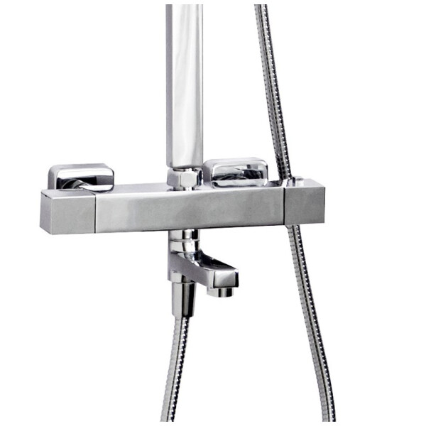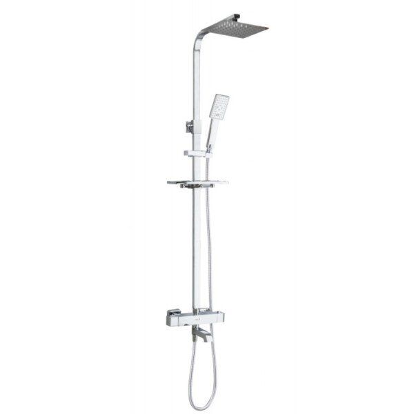 Прекрасно впишется в интерьер ванной комнаты душевая стойка TS 4244 с функцией термостата от немецкого производителя сантехники Weltwasser. Конструкция прочная и надежная, так как изготовлена из хромированного металла, который устойчив к повышенной влаге. На стойке имеется два вида душа: верхний, с изменяющимся углом наклона лейки, а также ручной - с тремя функциями. Смеситель изготовлен из латунно-медного сплава, не боится известковых отложений и водного камня. Штанга регулируется по высоте. В комплект входит термостат с изливом, полочка для ванных принадлежностей из небьющегося стекла.