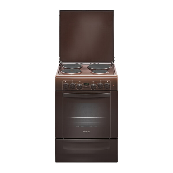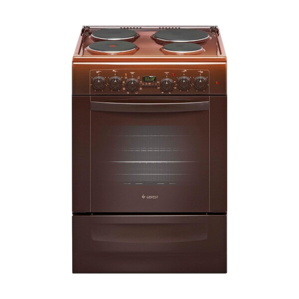 Электрическая плита GEFEST 6140-03 0001 выполнена в коричневом корпусе размерами 85x60x60 см. На поверхности плиты, изготовленной из эмалированной стали, размещены четыре конфорки разных размеров, что позволяет ставить на них посуду различного диаметра. Среди них одна экспресс-конфорка, на которой можно готовить в посуде большого диаметра: она способствует более быстрому приготовлению пищи и кипячению воды, а также на ней можно готовить блюда WOK.