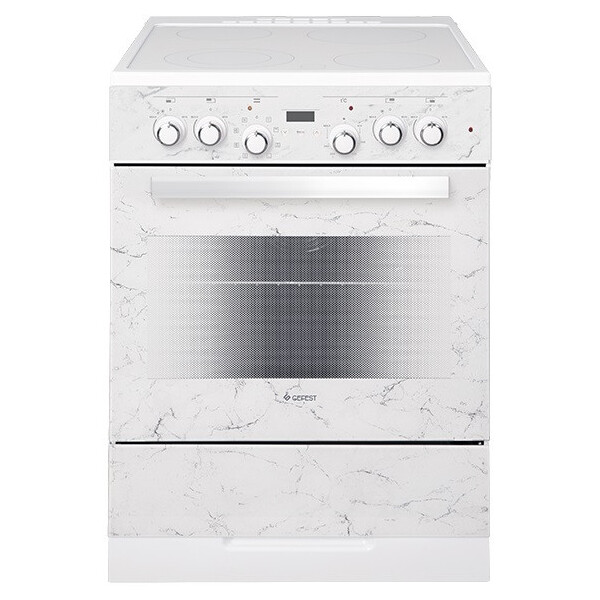 Электрическая плита белого цвета с дизайном под мрамор, со стеклокерамической варочной поверхностью и шириной 60 см. Стеклянный фасад, удобное управление, для контроля времени приготовления и автоматического отключения нагрева предусмотрен сенсорный многофункциональный таймер. Нижняя часть плиты - выдвижной ящик для хранения противней и кухонной посуды.