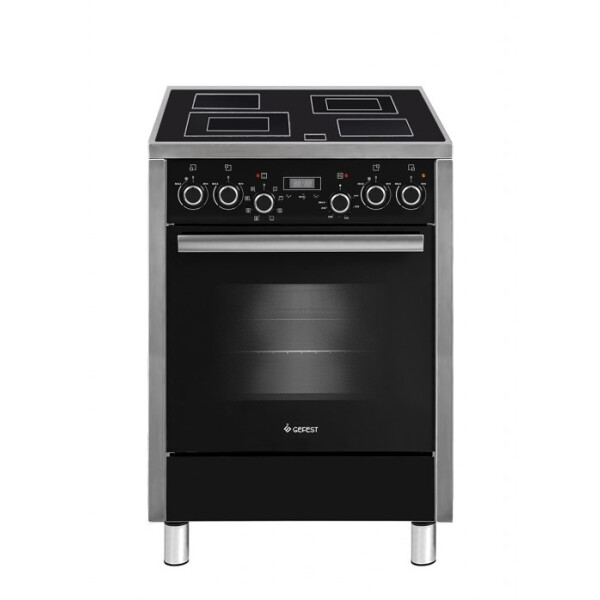 В черном цвете с накладками из нержавеющей стали электрическая плита, со стеклокерамической варочной поверхностью, ширина 60 см. Стеклянный фасад, удобное управление, для контроля времени приготовления и автоматического отключения нагрева предусмотрен сенсорный многофункциональный таймер. Нижняя часть плиты - выдвижной ящик для хранения противней и кухонной посуды.