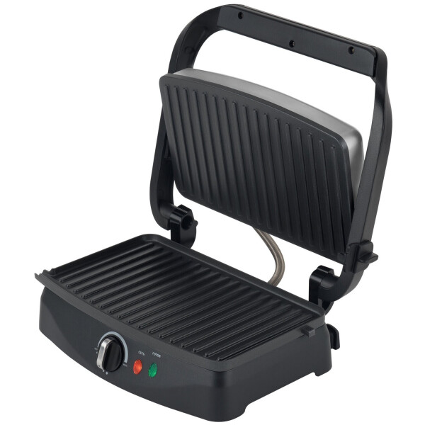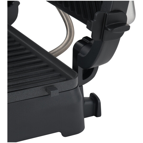 Ребристая поверхность рабочих панелей оставляет на еде рифленый рисунок, как при готовке на решётке с углями и открытым огнём. Она выполнена из антипригарного материала Titanium Pro, позволяющего готовить без использования масла. Под стекающий жир и сок в электрогриле предусмотрен специальный лоток, идущий в комплекте.