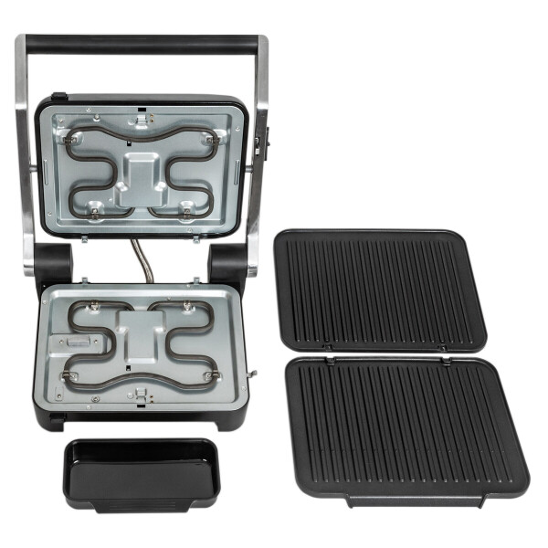 Конструкция гриля позволяет готовить в 2 режимах. В двустороннем режиме гриль закрывается крышкой, и продукты готовятся одновременно с двух сторон. В одностороннем режиме крышка гриля открывается на 90.