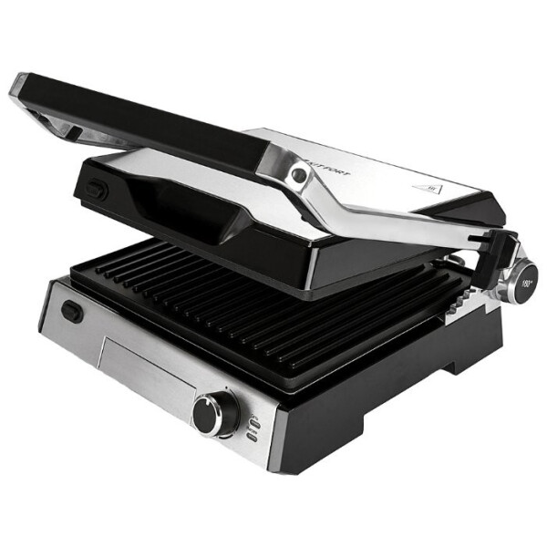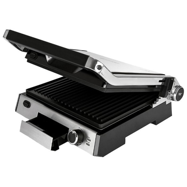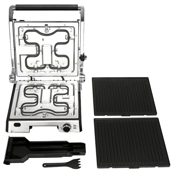 Гриль оснащен термостатом с плавной регулировкой, позволяющим выставить температуру вплоть до 230 градусов С. Нагревательные панели изготовлены из алюминия с нанесенным антипригарным покрытием. Они съемные и могут быть легко очищены. Допускается их мойка в посудомоечной машине.