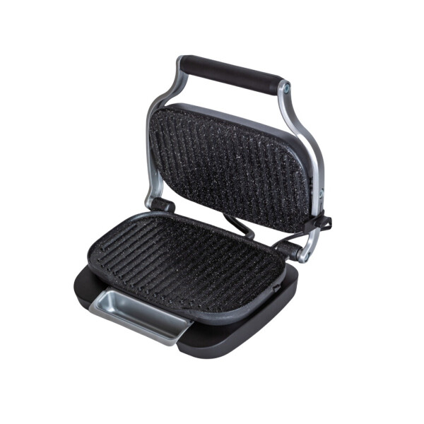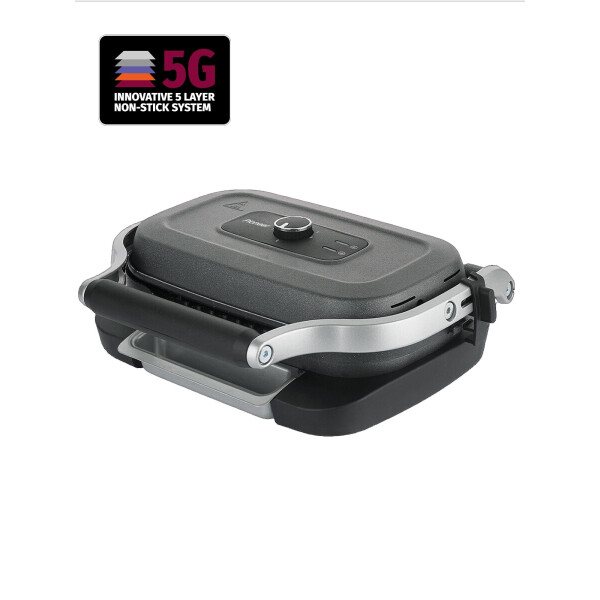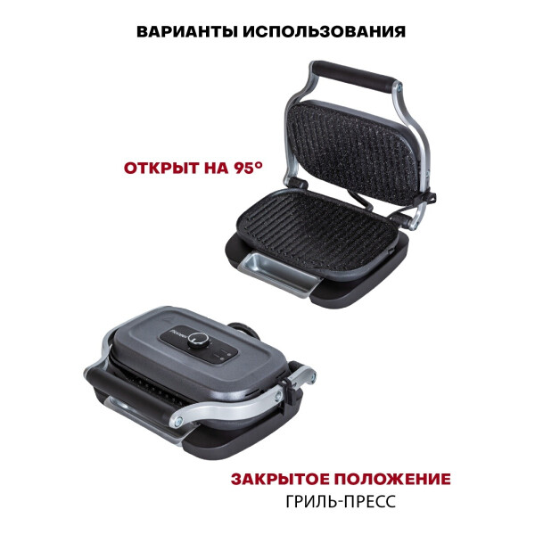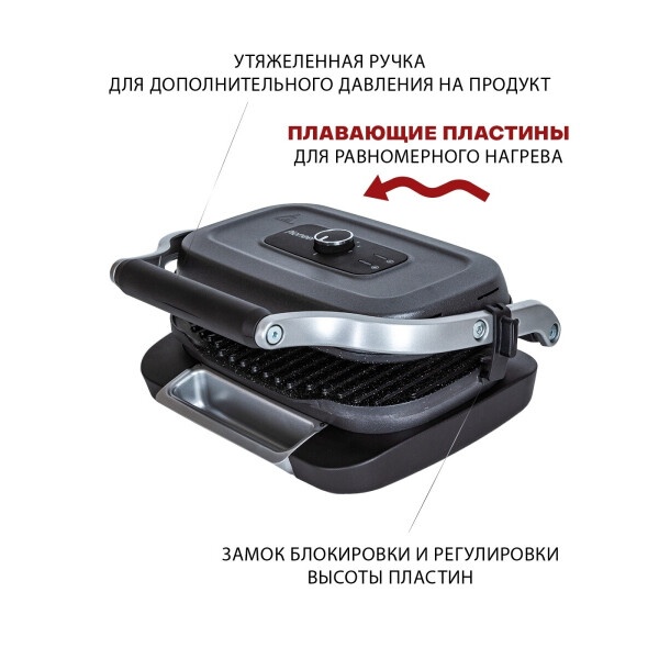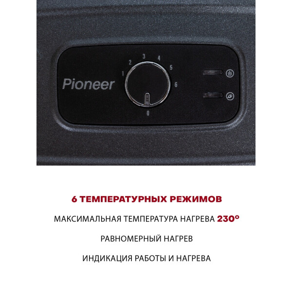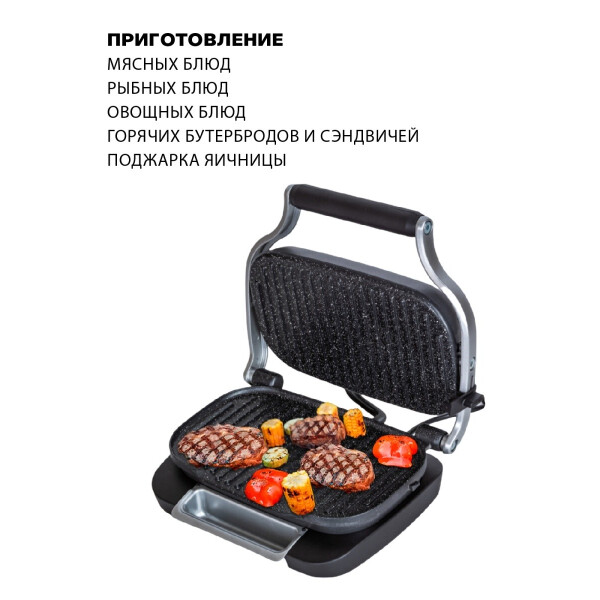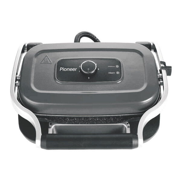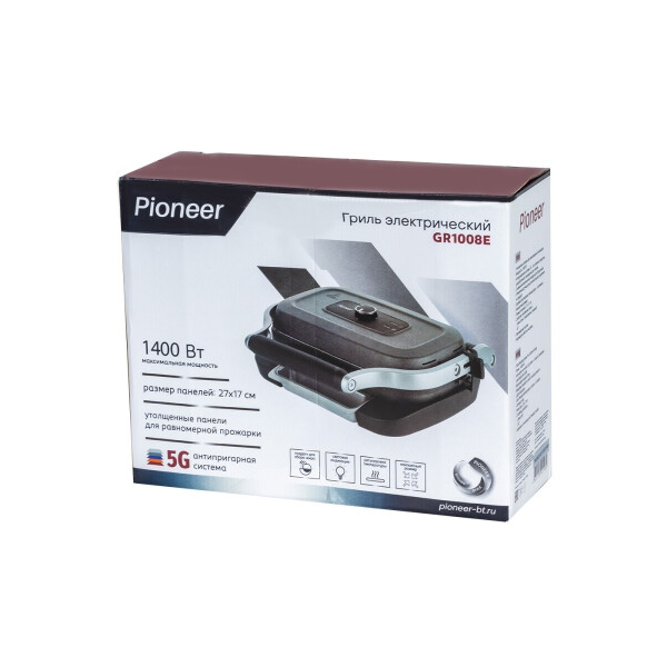 Электрический гриль Pioneer GR1008E мощностью 1400 Вт с антипригарным покрытием 5G и утолщенными панелями - идеальное решение для приготовления мясных, рыбных или овощных блюд, блинчиков, яичниц, панини или гренок в домашних условиях. КЛЮЧЕВЫЕ ХАРАКТЕРИСТИКИ: равномерный нагрев; регулировка уровня температуры нагрева-6 режимов; варианты использования - гриль-пресс и открытие на 95 градусов. ОБЛАСТИ ПРИМЕНЕНИЯ: приготовление мясных блюд; приготовление рыбных блюд; приготовление овощных блюд; приготовление горячих бутербродов, сэндвичей или бургеров; поджарка яичницы. КОНСТРУКТИВНЫЕ ДОСТОИНСТВА: утяжеленная ручка для дополнительного давления на продукт; утолщенные несъемные панели для равномерной прожарки (27x17см); замок блокировки и регулировки высоты пластин; откидные ножки для установки под наклоном; желоб и съемный поддон для сбора жира. ОСОБЕННОСТИ И ПРЕИМУЩЕСТВА: эргономичный дизайн; удобная регулировка температуры; max температура нагрева 230 градусов; индикация работы и нагрева.
