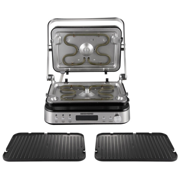 Электрогриль Redmond SteakMaster RGM-M819D универсальное устройство, которое можно использовать для приготовления стейков, бифштексов и колбасок, а также в качестве барбекю-жаровни и духовки. Оно работает в открытом и закрытом режимах. Система управления электронная. Температура для каждой панели настраивается отдельно, в диапазоне от 80 до 230 с шагом 5. Время можно установить с помощью таймера отключения, рассчитанного на срок от 30 секунд до 60 минут. У панелей две стороны, гладкая и рифленая. На них есть антипригарное покрытие, позволяющее экономить масло и обеспечивающее быструю и простую чистку под струей воды из крана или в посудомоечной машине. Для сбора жира предусмотрен съемный поддон. В комплект входит книга рецептов.