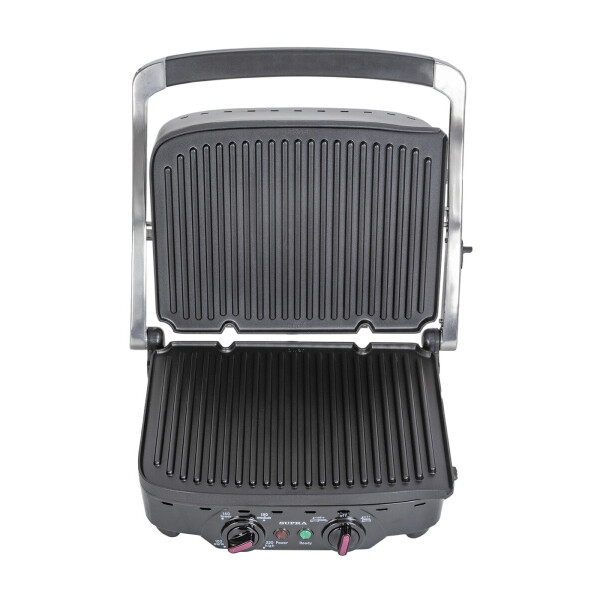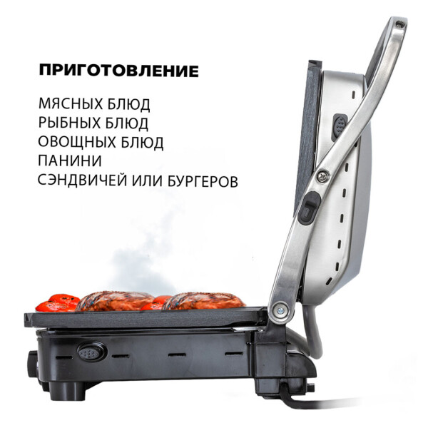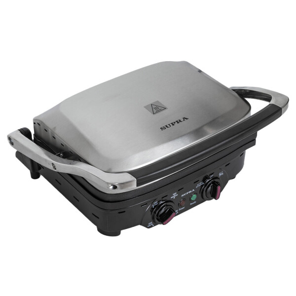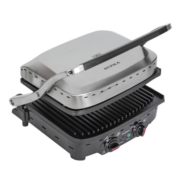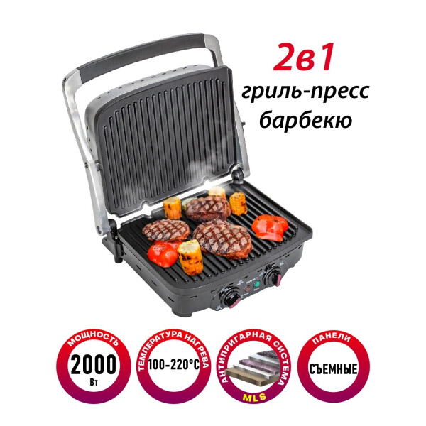 Современный мощный электрогриль Supra GS-7510 2 в 1 с многослойной антипригарной системой защитного покрытия MLS на съемных панелях, лотком для сбора жира панелями и 2 режимами приготовления - идеальное решение для приготовления мясных, рыбных или овощных блюд, панини или бургеров в домашних условиях. С электрогрилем от Supra гастрономический сезон шашлыков и барбекю автоматически продлевается на круглый год. Жарьте стейки и поджаривайте овощи в любое время и не выходя из дома. В зависимости от своих задач и предпочтений, вы можете готовить блюда на гриле под крышкой (гриль-пресс) и в режиме барбекю, когда обе панели, верхняя и нижняя, раскрываются на 180 градусов, как одна большая жарочная поверхность. Рабочие панели снимаются с помощью специальной кнопки, расположенной на корпусе прибора. Панели со специальным защитным покрытием MLS можно мыть в посудомоечной машине. Равномерный и быстрый нагрев сохраняет вкус, витамины и сочность блюд.