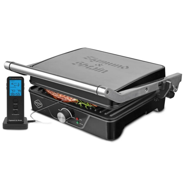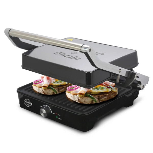 Электрический гриль Zigmund Shtain ZEG-920, Прибор 4 в 1, в комплект которого входят съёмные панели с антипригарным покрытием. Функции: Гриль, Барбекю, Запекание, Сэндвич-тостер. Максимальная мощность: 2000 Вт, Номинальное напряжение: 220-240 В, 50/60 Гц, Температура нагрева: 100-220, Автоматическое определение толщины стейка и времени приготовления, фиксация верхней панели: 2 уровня, Рабочие панели: съемные 2 шт. Поверхность панелей рифленая, Покрытие панелей: антипригарное, Поддон для сбора жира: внутренний/съемный, Автоотключение при перегреве, Материал корпуса: металл/пластик, Габаритные размеры: 35.7х34.4х12.9 см, Длина шнура: 0,7 м, Цвет стальной ,Гарантия 1 год, Страна производства КНР.