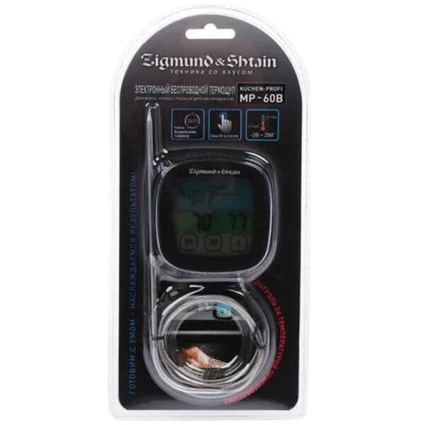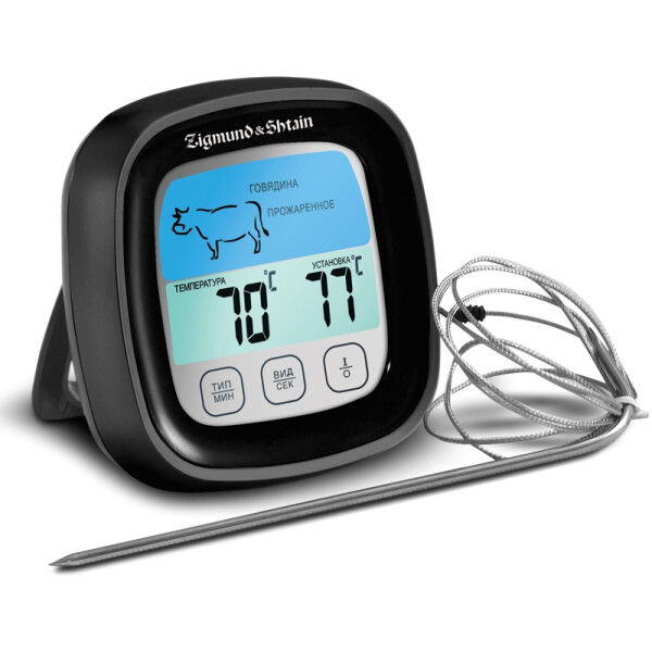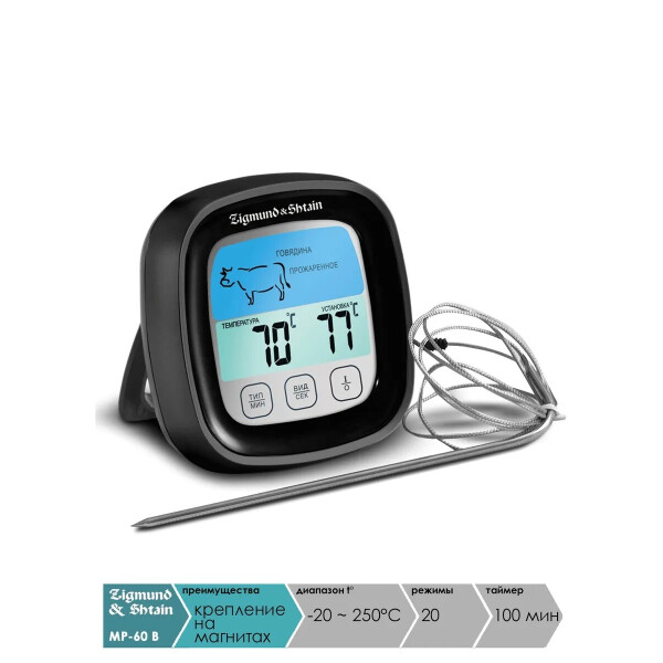 Термощуп Zigmund & Shtain MP-60 B устройство, которое незаменимо для приготовления вкусного и в меру прожаренного стейка. Модель Zigmund & Shtain MP-60 B прекрасно справится с прожаркой 8 видов мяса (рыба, курица, индейка, свинина, котлета (фарш), телятина, баранина, говядина). Для этого вам потребуется лишь установить один из пяти температурных режимов.