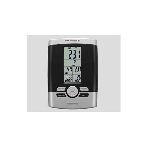 время, дистанция, скорость, калории, обороты в мин., пульс, фитнес-тест (Recovery)