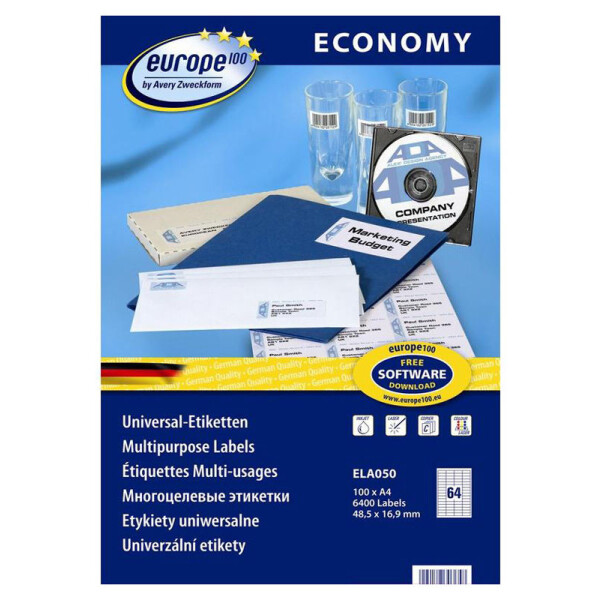 Самоклеящиеся этикетки ТМ Europe 100 производства Avery Zweckform изготовлены из бумаги белого цвета. Упаковка содержит 100 листов формата А4, на одном листе — 64 этикетки размером 48,5×16,9 мм каждая. Диапазон применения широк: от наклеек на конверты до маркировки на производстве. Этикетки оформляются и распечатываются в нужном количестве самостоятельно. Совместимы с лазерными и струйными принтерами и многофункциональными устройствами любой марки. Гарантированное качество печати благодаря новой структуре бумаги и технологии, исключающей загрязнение аппаратуры частицами клея. Возможность переклеивания отсутствует.