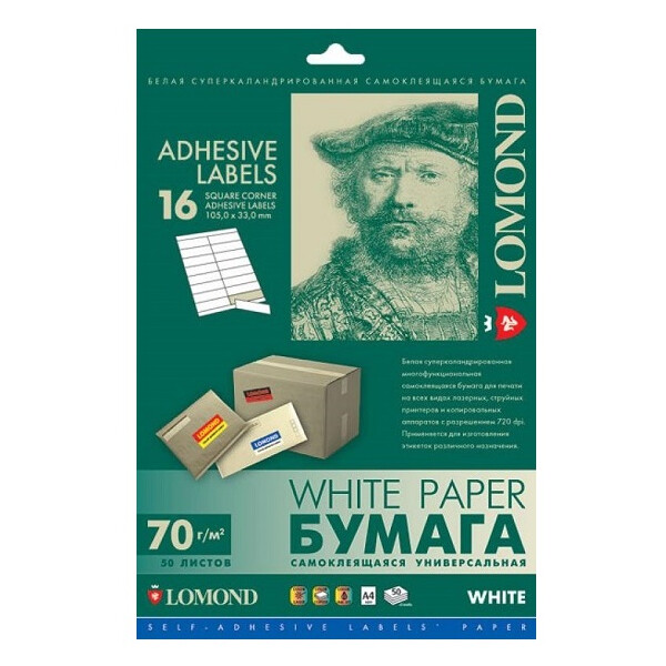 Бумага Самоклеящаяся бумага LOMOND универсальная для этикеток, A4, 16 делен. (105 x 37 мм), 70 г/м2, 50 листов