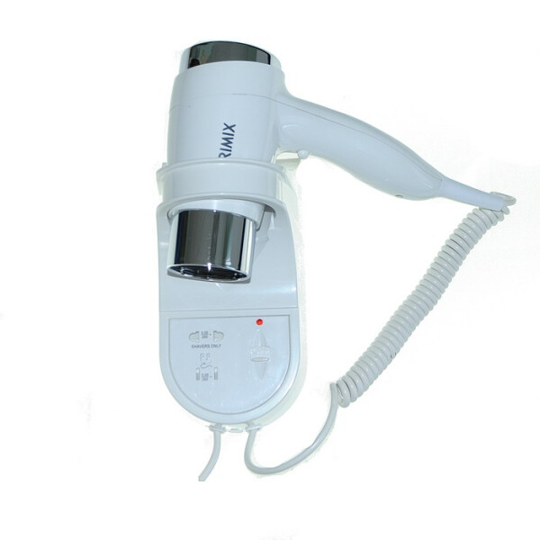Фен для волос в ванную комнату с торцевым креплением, с розеткой для бритвы, белый с хромом в окантовке, 1200W. 2 скорости + режим холодного воздуха.