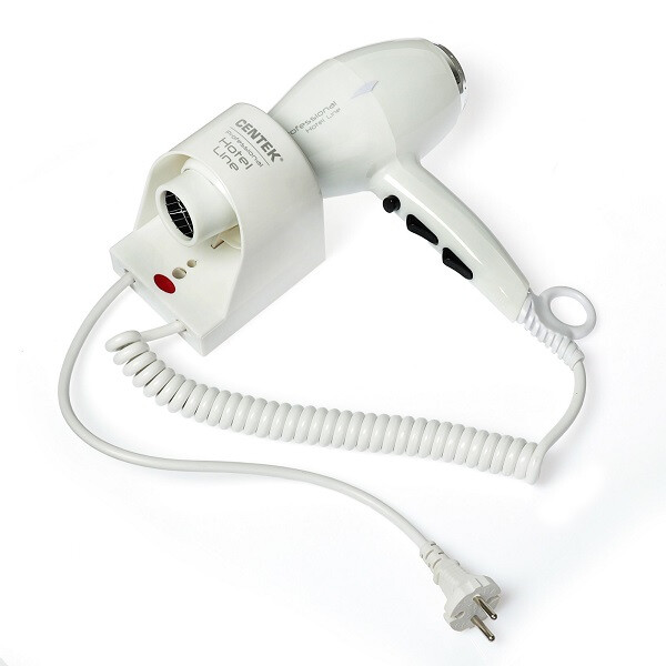 Фен Centek CT-2251 представлен в белом полноразмерном дизайне и дополнен базой для настенного крепления.