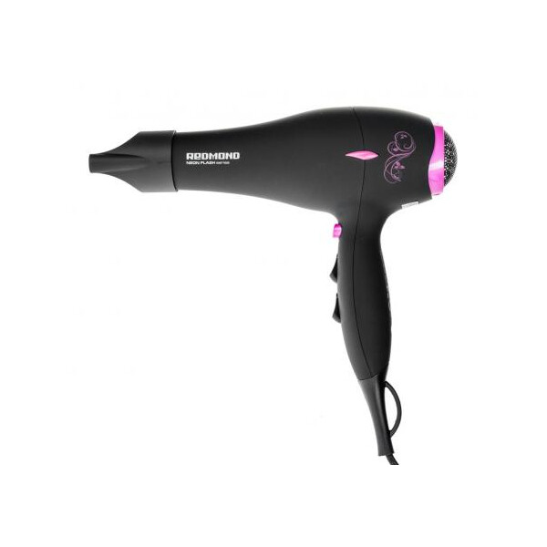 Фен Redmond RF-519 в черном корпусе украшен яркими розовыми элементами и стильным растительным узором. Модель имеет довольно высокую мощность, равную 2000 Вт. Предусмотрено три варианта температуры нагрева и две скорости подачи воздуха, которые можно регулировать автономно. Розовая кнопка запускает режим холодного обдува, позволяющего надежно зафиксировать уже готовую укладку.