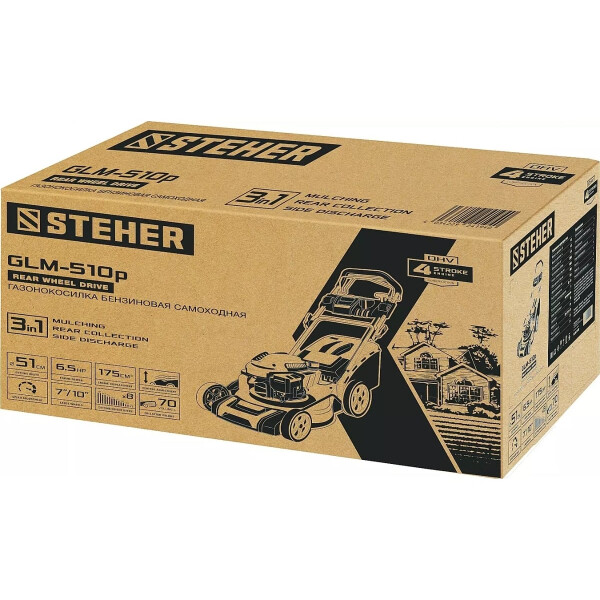 Самоходная бензиновая газонокосилка STEHER GLM-510p отлично поухаживает за газоном на вашем садовом участке или придомовой территории.