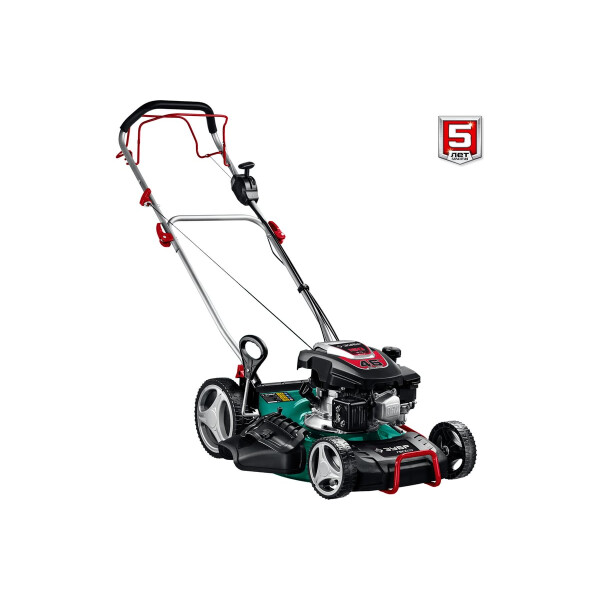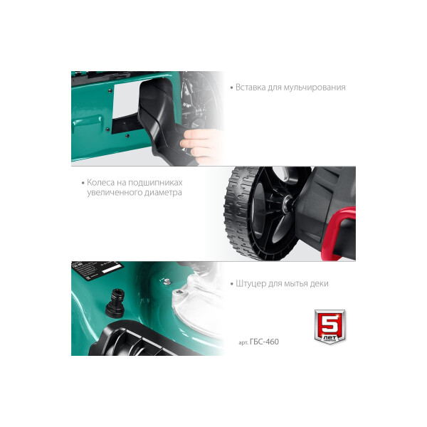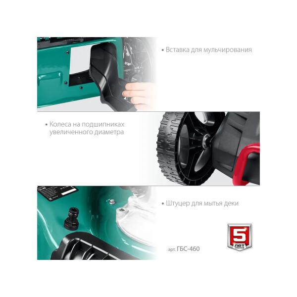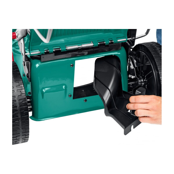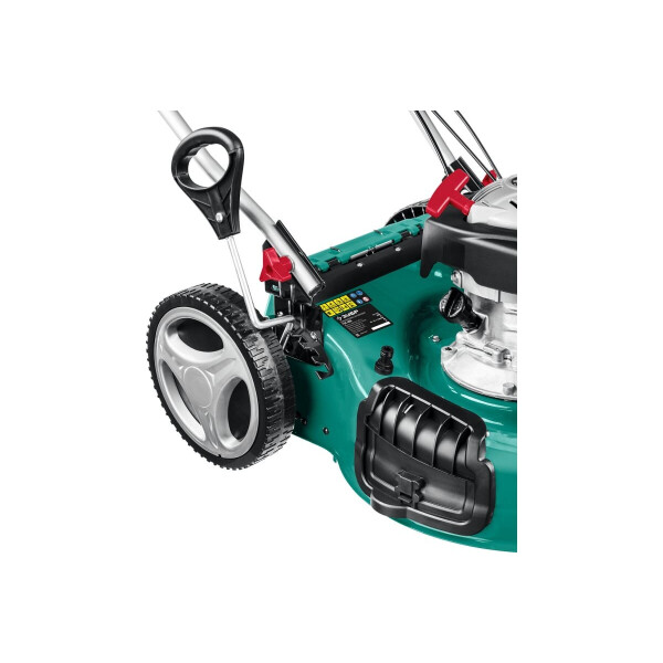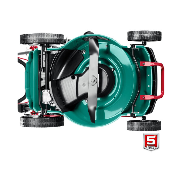 За счет привода на задние колеса для передвижения газонокосилки необходимы минимальные усилия, что облегчает управление и ускоряет процесс работы.