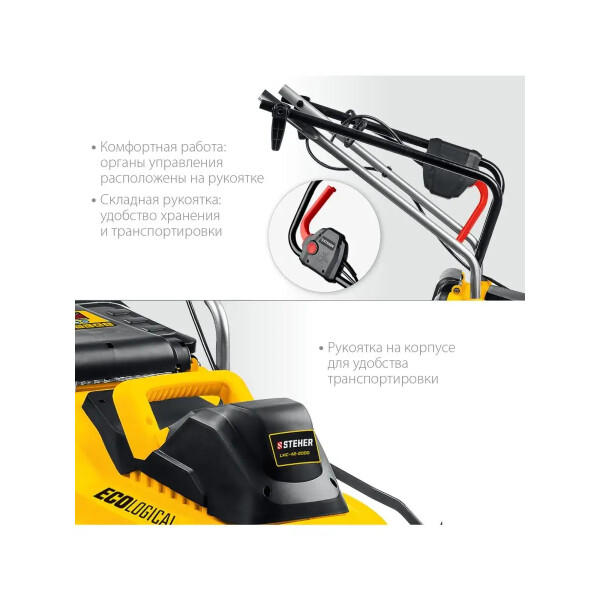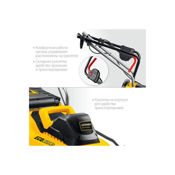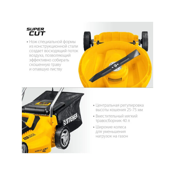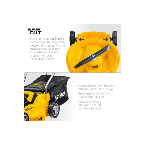 Для подстригания травы при уходе за газоном (с вращающимся ножом). Имеет функции кошения со сбором травы и регулировки высоты кошения.