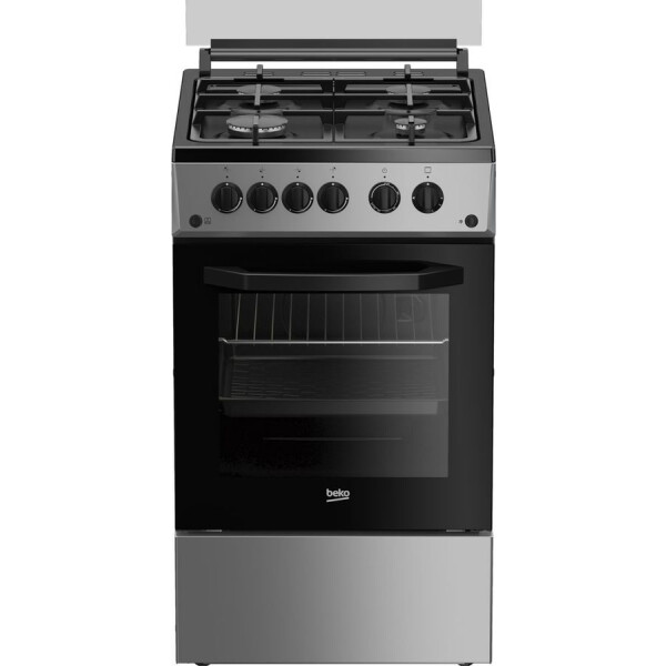 Газовая плита Beko FSGT 51138 GSS серебристого цвета с электроподжигом, механическим таймером, газовым грилем, вертелом, газ-контролем духовки и конфорок.