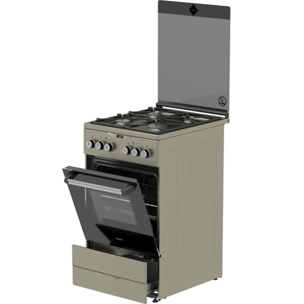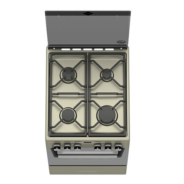 Рабочий стол оснащен четырьмя газовыми горелками различной мощности, решетка стола чугунная. Над рабочим столом плиты установлена крышка из закалённого стекла.