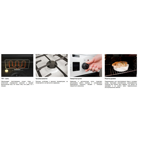 Комбинированная плита в новом дизайне, оснащена электронными часами, привнесет комфорт в повседневный быт и создаст эстетическую гармонию современного кухонного интерьера. Прочные чугунные решетки стола не деформируются со временем. А благодаря конвектору и ТЭН-грилю Ваше блюдо всегда будет сочным, равномерно прожаренным, с аппетитной золотистой корочкой.