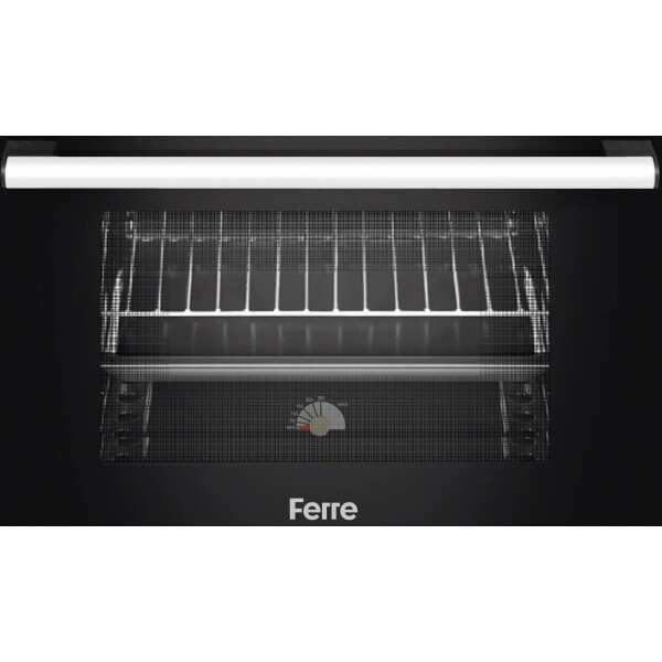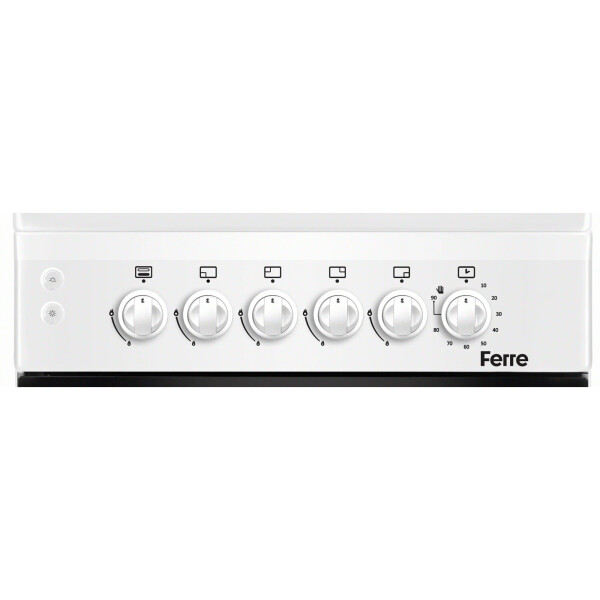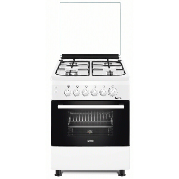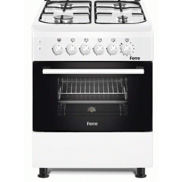 Газовая плита Ferre с поворотными ручками управления выполнена в аккуратном белом дизайне. Модель оснащена газ-контролем духовки и интегрированным электророзжигом горелок стола и духовки.