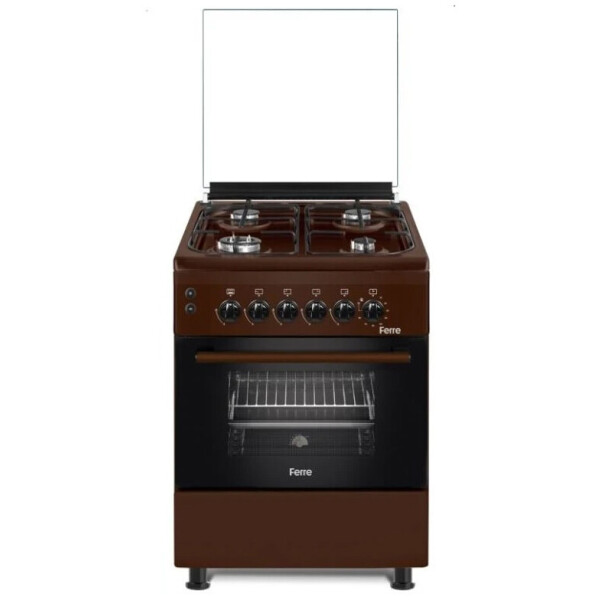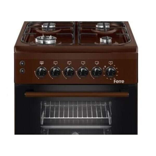Газовая плита Ferre выполнена в стильном кофейном цвете с поворотными ручками управления.