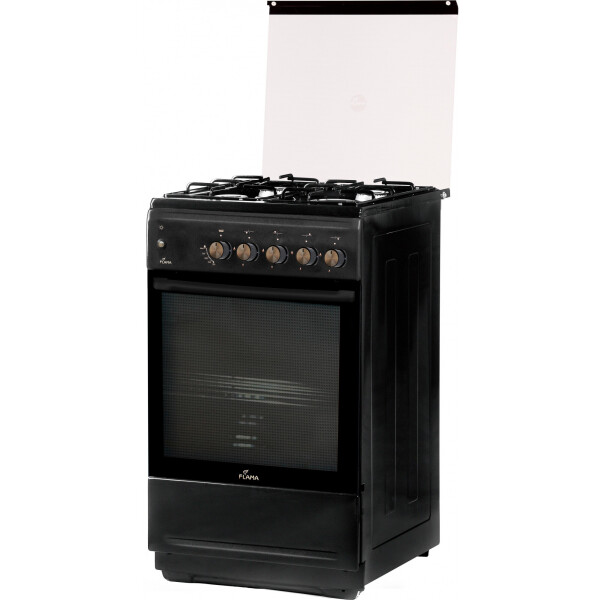 Черная газовая плита Flama в корпусе из эмалированной стали рассчитана на приготовление сразу нескольких блюд. Для этого она имеет 4 конфорки и духовой шкаф объемом 50 л.