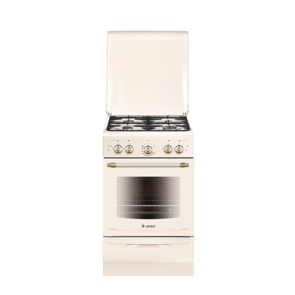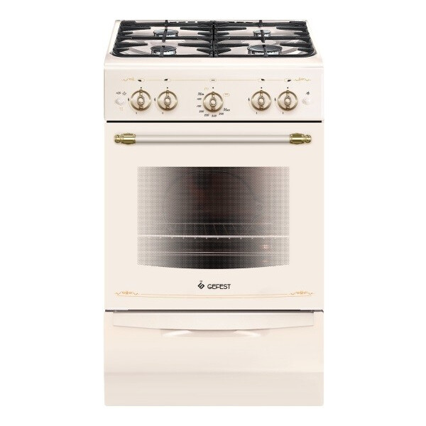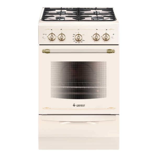 Газовая плита Gefest 5100-02 0186 полностью покрыта качественной эмалью, устойчивой к износу. Варочная поверхность состоит из четырех конфорок, работающих на газу. Поверх панели расположена специальная чугунная решетка, обладающая длительным сроком годности. Духовка так же работает на газу и включается при помощи системы механических поворотных переключателей.