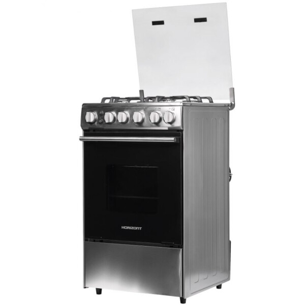Газовая плита Horizont выполнена в элегантном цвете нержавеющей стали с поворотными ручками управления и оснащена механическим таймером.