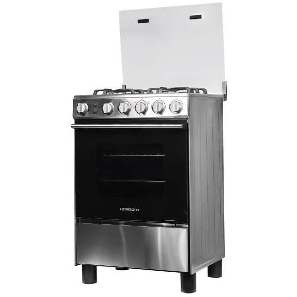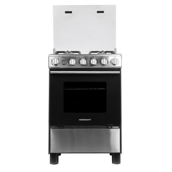 Газовая плита Horizont выполнена в цвете нержавеющей стали с поворотными ручками управления. Модель оснащена надежными ножками-опорами.