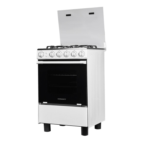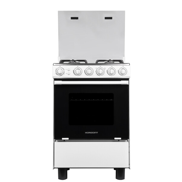 Газовая плита Horizont выполнена в элегантном белом цвете, с поворотными ручками управления. Модель оснащена надежными ножками-опорами.