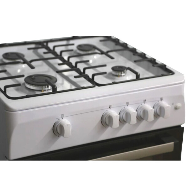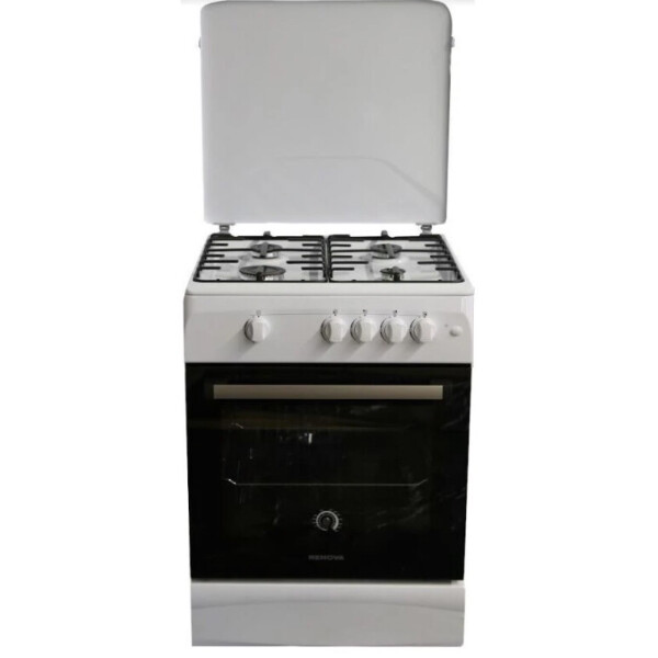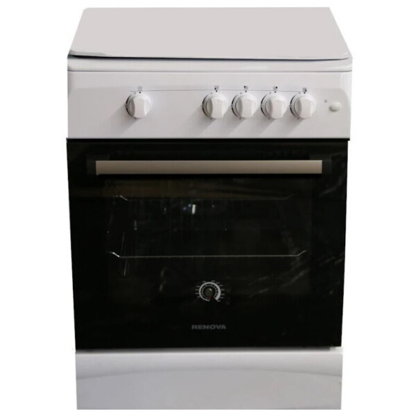 Газовая плита Renova с поворотными ручками управления выполнена в аккуратном белоснежном дизайне. Модель оснащена полным газ-контролем и интегрированным электророзжигом горелок стола и духовки.