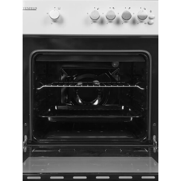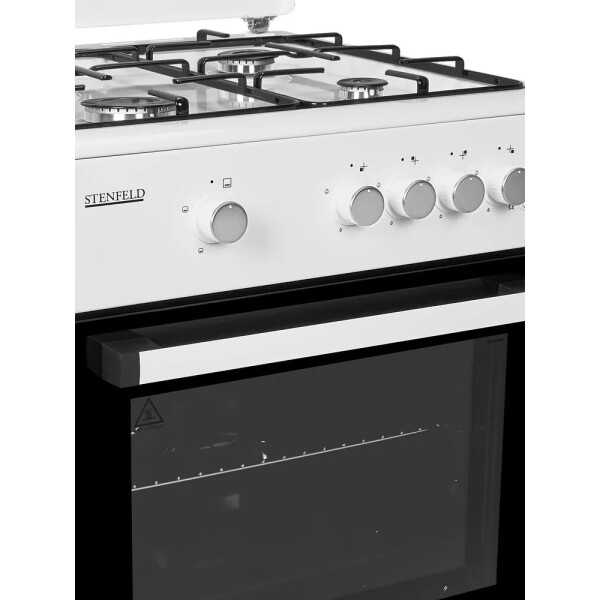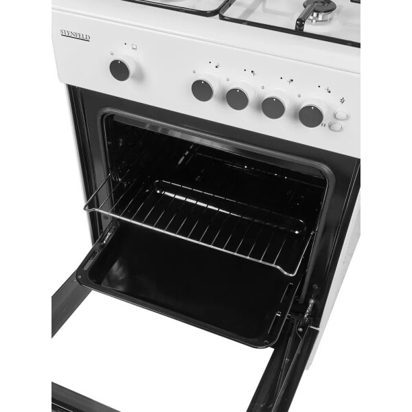 Газовая плита STENFELD с поворотными ручками управления выполнена в аккуратном белоснежном дизайне. Модель оснащена газ-контролем духовки и интегрированным электророзжигом горелок стола и духовки.