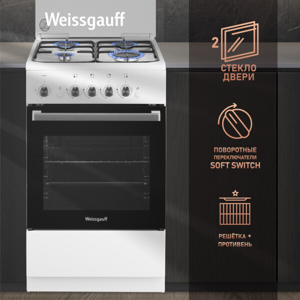 Газовая отдельностоящая плита Weissgauff шириной всего 50 см, обладающая впечатляющим объемом 60 литров духовой камеры с функцией газ-контроля и подсветки, а также 4 высокоэффективными конфорками рабочей поверхности с функцией автоматического электроподжига - это функциональная и практичная бытовая техника, которая станет основой вашей кухни на долгие годы!