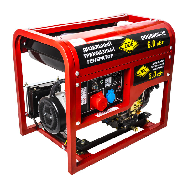 DDE DDG6000-3E – надежный трехфазный дизельный генератор для строительной площадки или для использования в качестве резервного источника электроэнергии в дачном доме. Преимущества модели: мощность – 6 кВт; автономная работа – до 6,5 ч; автоматический регулятор напряжения; электростартер; силовая розетка на 220 В и розетка 380 В с брызгозащитой; прочная рама; эффективный глушитель.